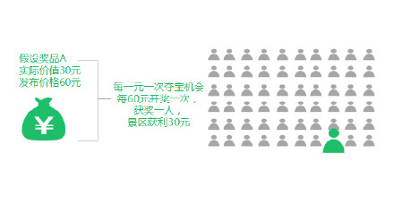 该游戏的模式为众筹模式,即景区预先设立一个或多个奖品,游客通过众筹支付的方式达到奖品的设置金额,满额后系统自动进行开奖并公布中奖号码。其中设置金额高于奖品实际的采购金额,营收方式主要为差价获利。